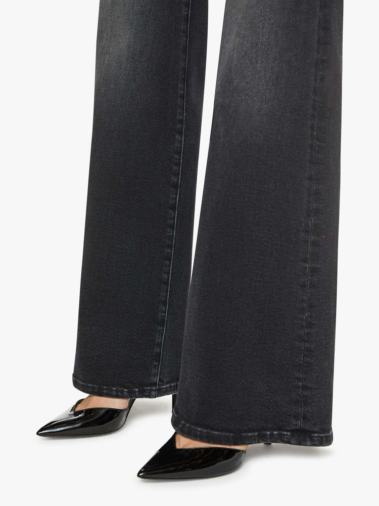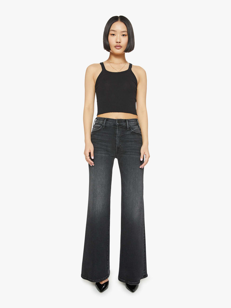 The Lil Hustler Roller is a 70s-inspired wide leg jean with a high rise, 30-inch inseam and a clean hem. Designed in a stretch cotton blend, Not Today Satan is a black wash with whiskering, fading and tonal hardware.