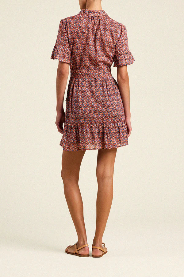 The Martinique dress features long pleats from the waist give extra movement to the shortened tiered skirt. Completed with matching self-fabric sash and hidden side pockets. Shown here in Mare Ditsy and made from cotton voile.
