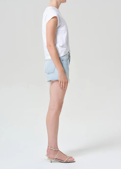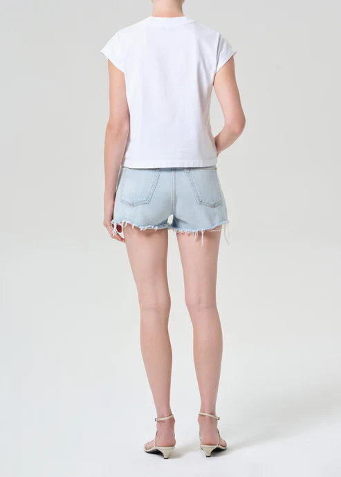 The Parker Short features a flattering high-rise and a relaxed silhouette through the hips, designed to feel effortlessly tailored to you. Finished in a pale bright indigo wash, this pair brings a fresh, sun lifted twist to the classic vintage cut-off. Crafted from rigid non stretch 100% regenerative cotton denim with a soft hand feel.